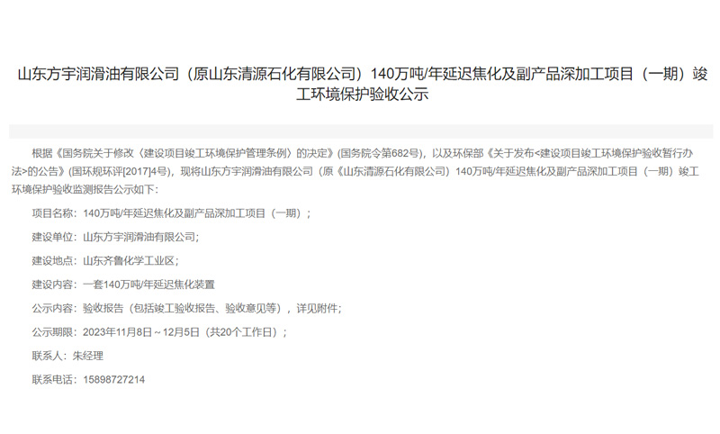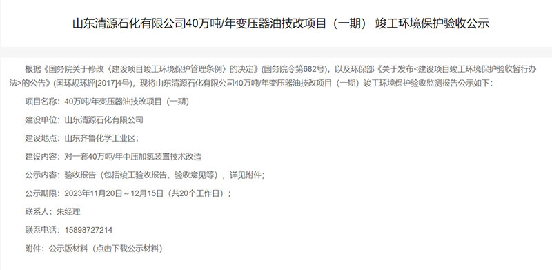 山東清源石化有限公司40萬噸/年變壓器油技改項(xiàng)目(一期)竣工環(huán)境保護(hù)驗(yàn)收公示